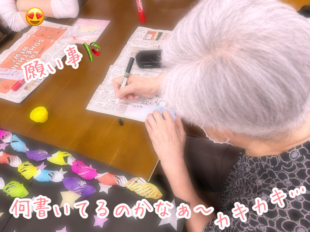 今月は、七夕🎋との事で、願い事を書き、スタッフ手作りの、短冊に、一人一人の願いが届くように、貼り付けて、ホールに飾りました💕