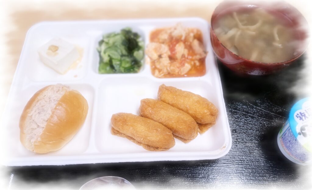 今回は、いなり寿司、鶏肉のトマト煮、シーチキンサンド、きゅうりとわかめの酢の物、スープ、ヨーグルト 冷奴